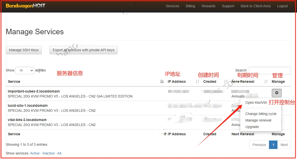 点击“Services”右侧小三角,选择“My Services”可以查看已购买的VPS列表,在列表中有VPS的信息、IP地址、创建时间、到期时间、管理(Manage)和KiwiVM控制台入口,点击“Open KiwiVM”,进入VPS控制台。