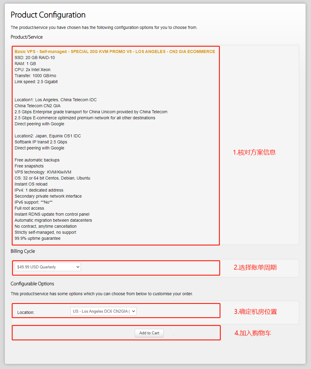 搬瓦工首页选择适合的VPS套餐(搬瓦工全部套餐),点击购买跳转至购买界面,购买界面基本信息如下: