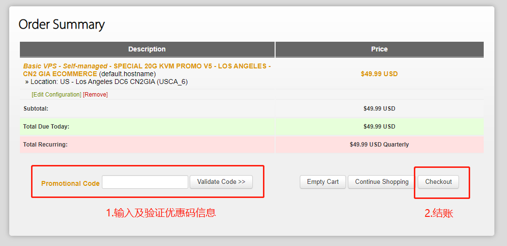 输入优惠码(最新优惠码见网站主页),点击“Validate Code”验证后点击结账。
