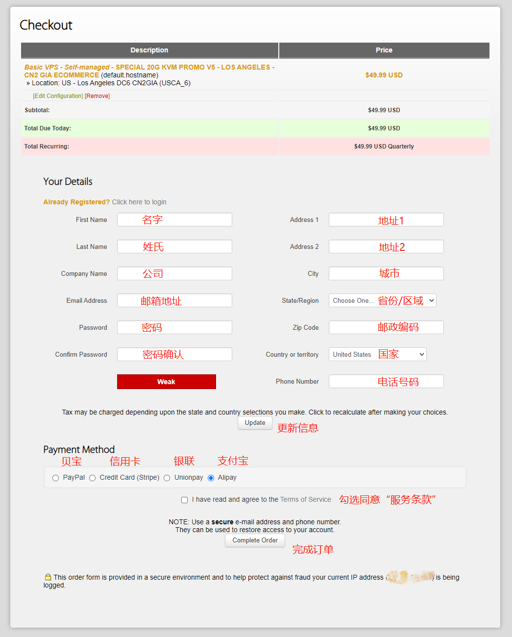 输入您的基本信息,选择支付方式(推荐使用支付宝付款)进行结账,完成订单。完成订单后会收到搬瓦工发送的发票信息邮件,查收确认后即可进入搬瓦工操控面板进行主机设置和使用。(搬瓦工使用教程)