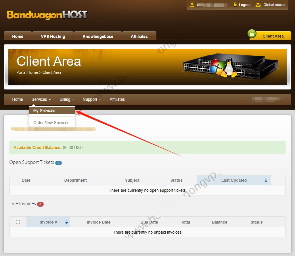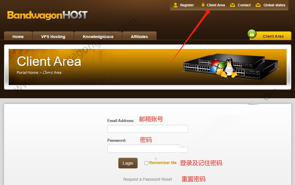 根据搬瓦工购买教程,完成VPS套餐购买后。访问搬瓦工英文官网,点击右上角“Client Area”,输入邮箱账号、密码等,进行登录即可。