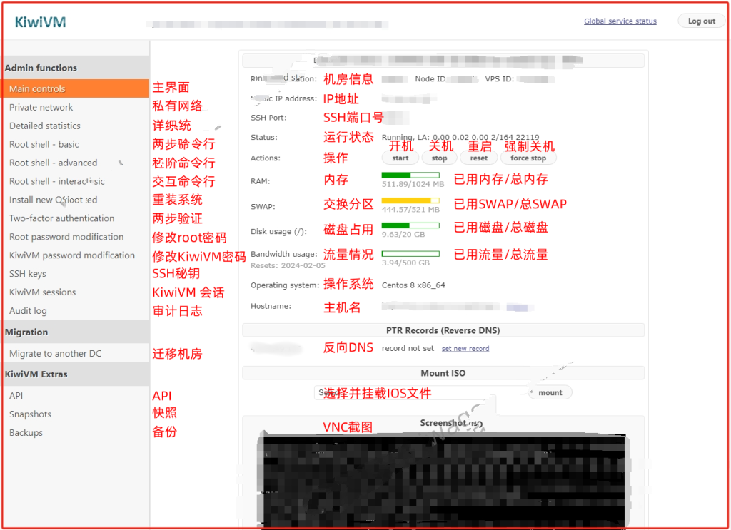 点击“Open KiwiVM”,进入VPS控制台后,可以看到KiwiVM控制面板,可以查看VPS所有信息:IP地址、端口、CPU、 内存和系统版本;重装系统、修改ROOT密码、迁移机房、备份和恢复镜像等操作也全部在KiwiVM控制面板操作。