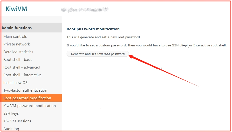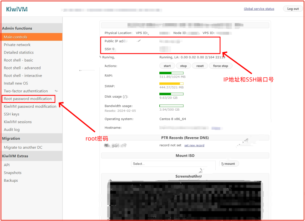 进入KiwiVM控制面板后,查看IP地址、SSH端口号、root密码,使用 SSH远程连接工具(如Putty、Xshell等)登录,操作VPS主机即可。(注:原root密码在购买时会随邮件发送至邮箱,现不再随邮件发送,需选择左边菜单栏中的“Root password modification”,然后“Generate and set new root password”,即可获得root密码)